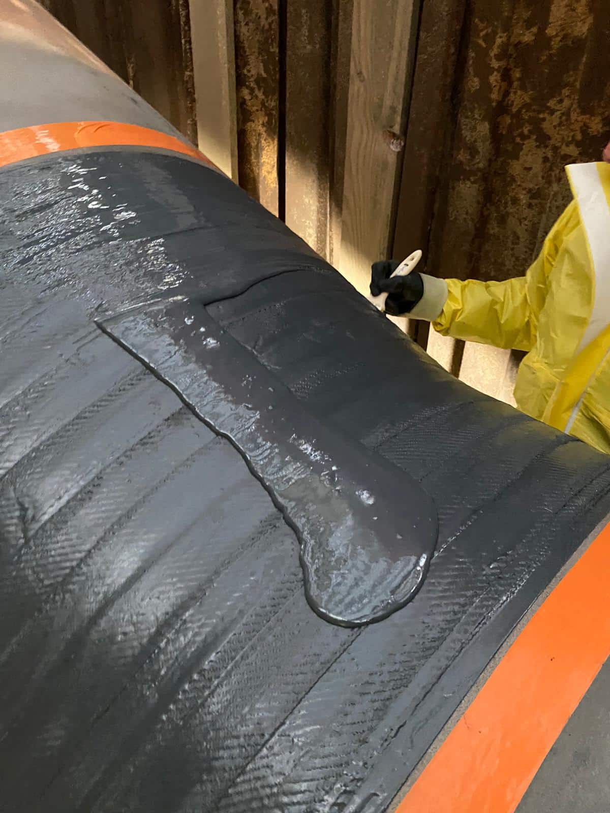 - One layer of R3X70+ resin was applied on the defected area to ensure a good wetting of the composite wrapping with the steel pipe.