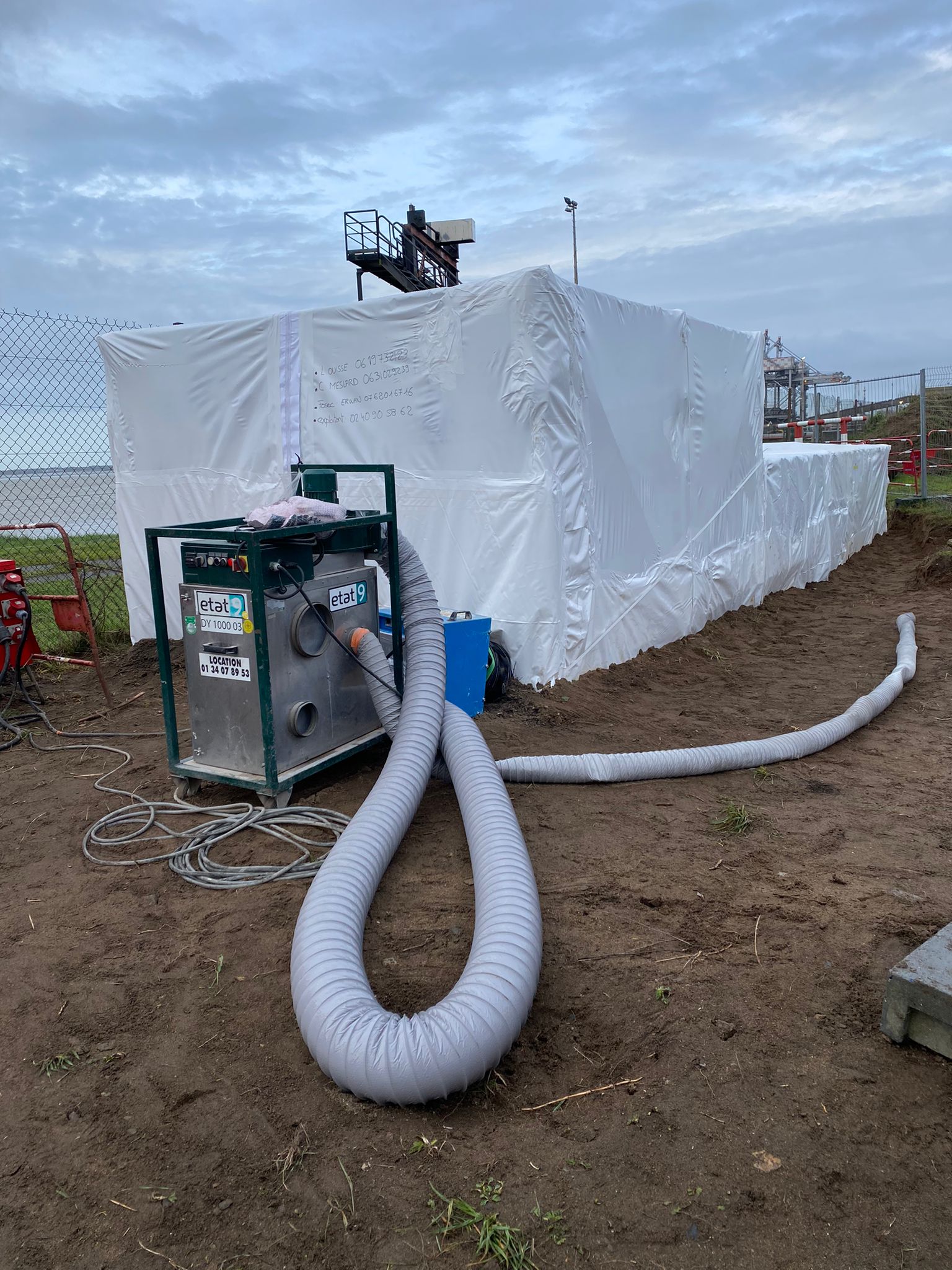 Because of the cold temperatures outside, the working area was isolated and equipped with a dehumidifier and heating system in order to keep the optimal conditions for the composite application.