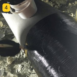 4. Wrapping using Kevlar and 3X resin. 68 layers of composite (over 88cm) were applicated to reinforce the pipe i.e. 34 passes (50% overlap).