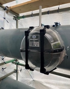 4. Hard shell application.The rigid sleeve was prepared to fit perfectly with the location of the valve and installed over the flange (hold with ratchet belts).