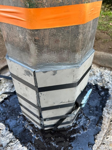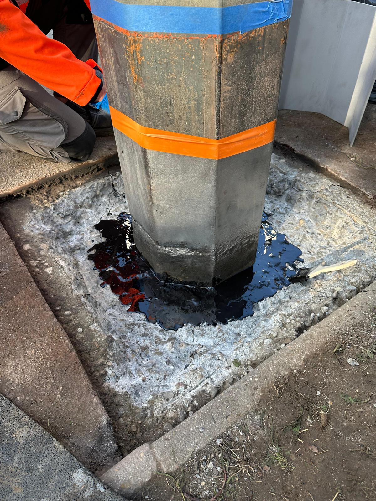 3X resin was applied at the base of the structure to seal the junction between the concrete and the pole. Then metal inserts, previously designed and manufactured to fit with the specific octogon geometry of the structure, were installed around the pole and fixed using 3X filler and ratching belts. - COMPOSITE WRAPPING REINFORCEMENT