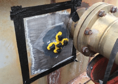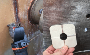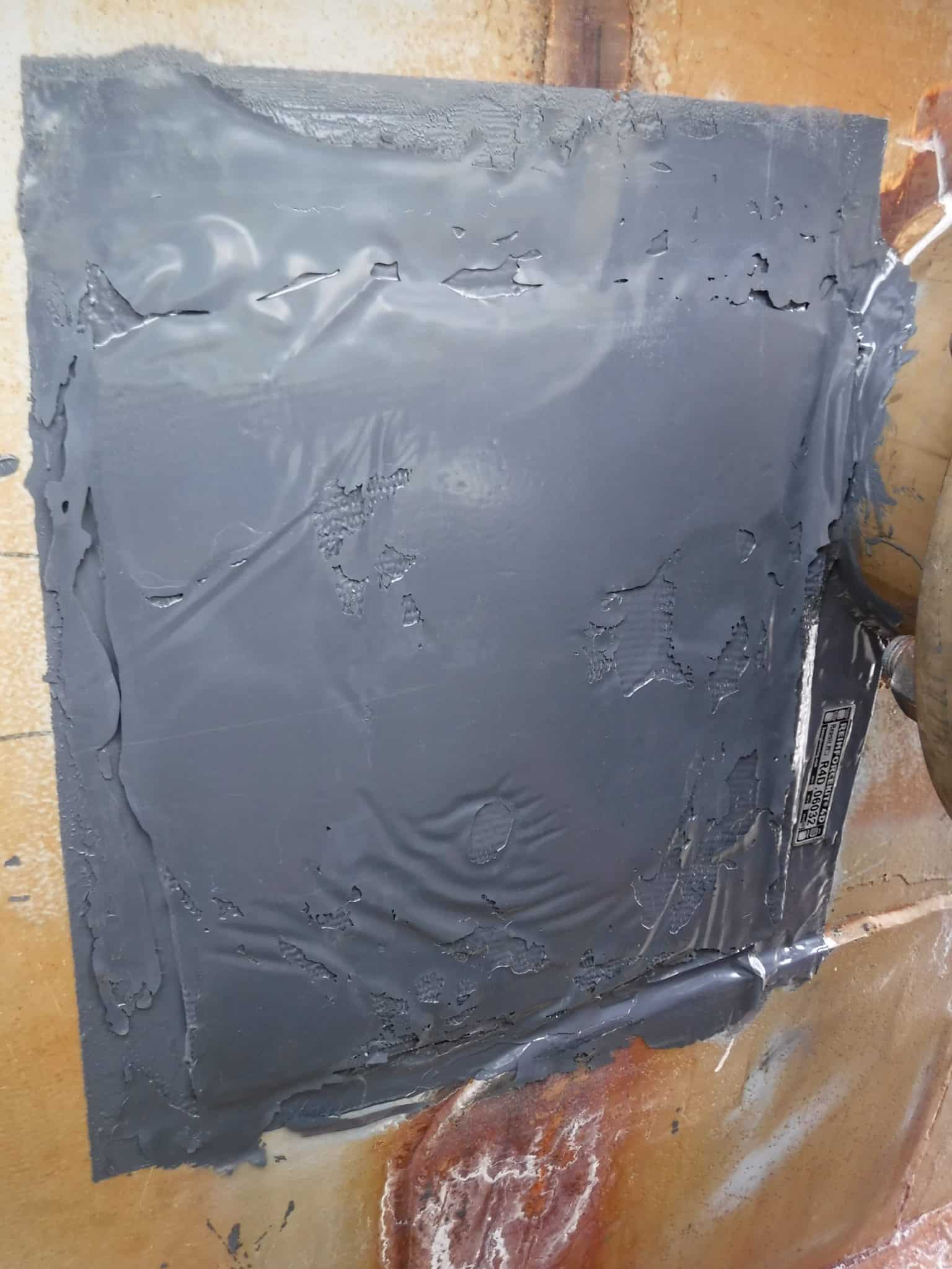 - Finalization of the repair. Final layer of R3X5 resin was applied on the edges of the repair system for protection and identification plate was positioned on the tank for traceability. Rigid cover plate was finally applied using magnets to compress the patch and keep the position during the curing.