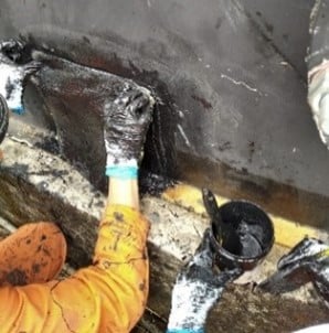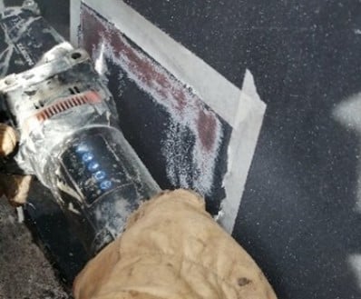 The work team carried out the surface preparation, using Bristle Blaster® machine, to remove the coating and to get a good surface roughness (greater than 60 µm) to ensure the adherence between the tank and the composite solution. Hygrometric conditions were checked and the surface was cleaned and degreased with ethanol.